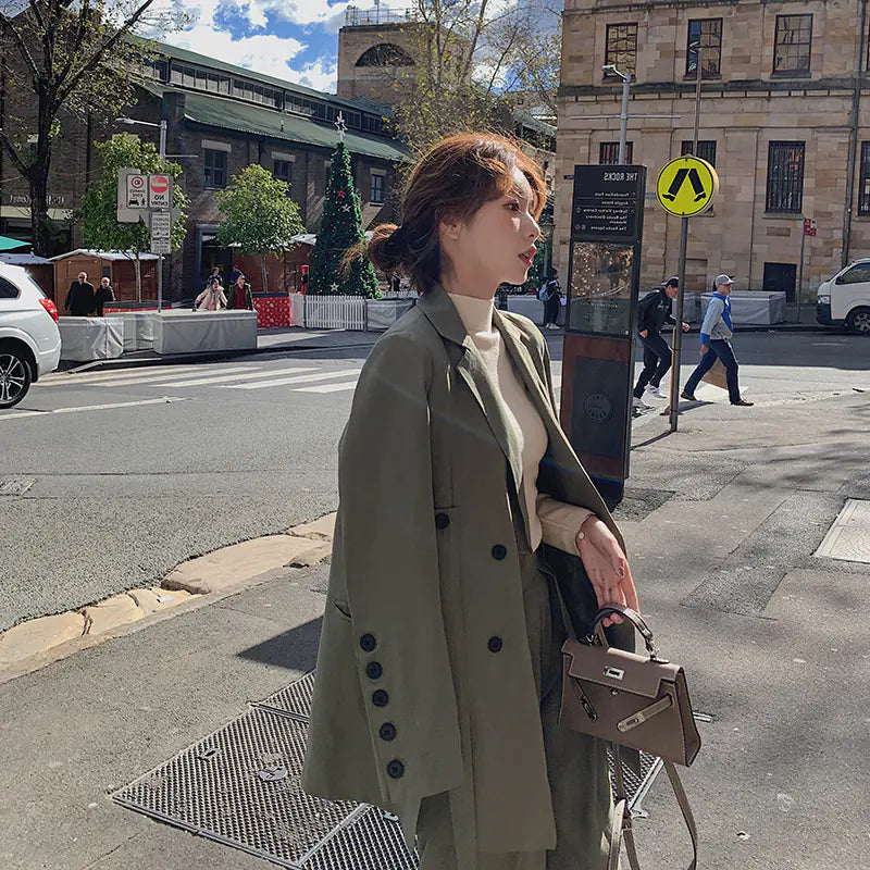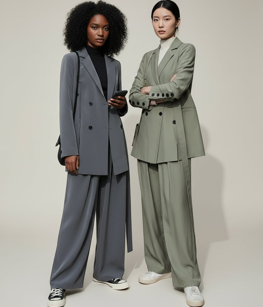 Descubra o equilíbrio perfeito entre sofisticação e conforto com este fato feminino de duas peças, composto por um blazer curto e calças de perna larga. Feito em fibra de poliéster de alta qualidade, garante suavidade ao toque, respirabilidade e um caimento impecável. Disponível nas cores verde e cinzento, este conjunto adapta-se facilmente a qualquer ocasião — do escritório a um jantar elegante.
