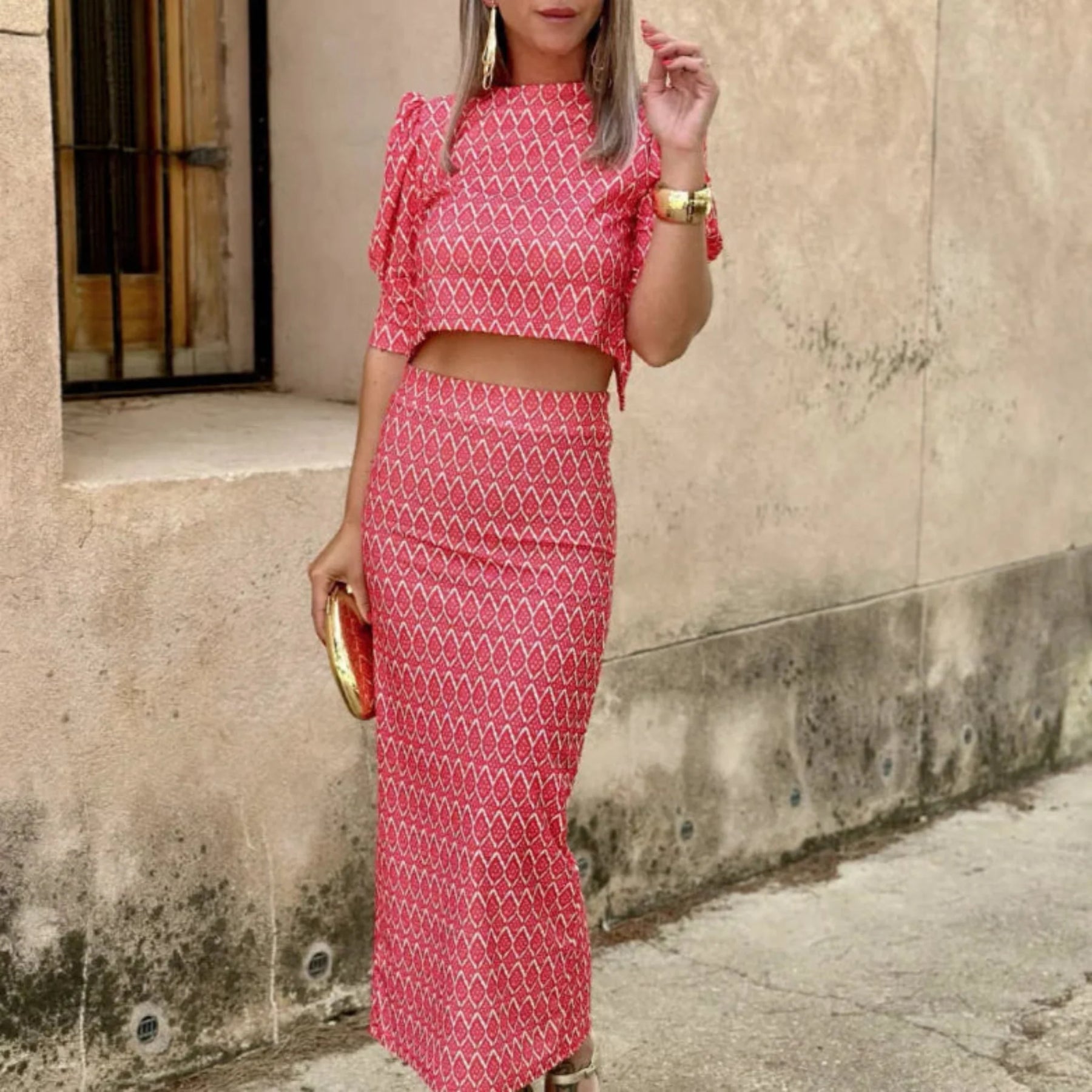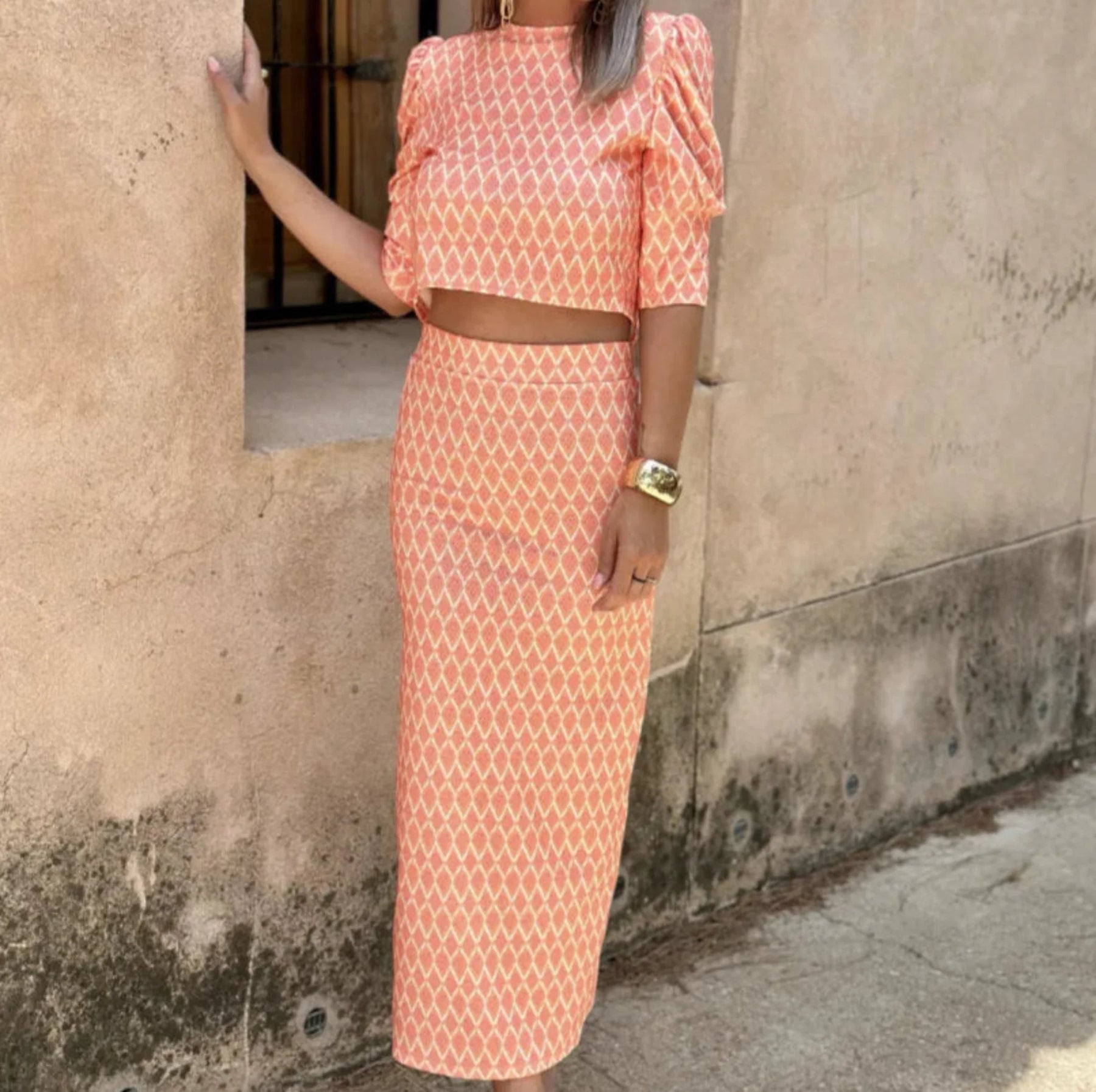 Elegância premium em tecido floral delicado. Conjunto que combina tradição e modernidade.