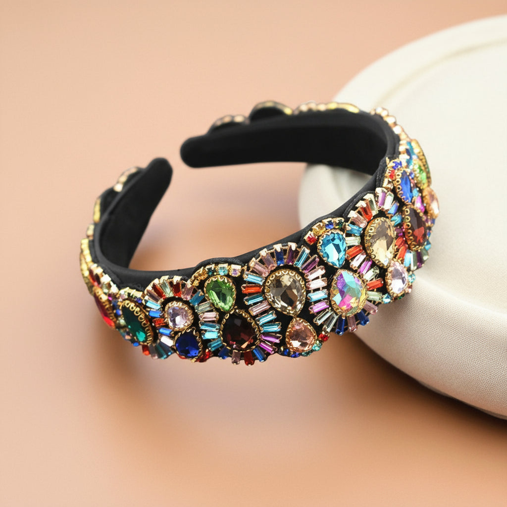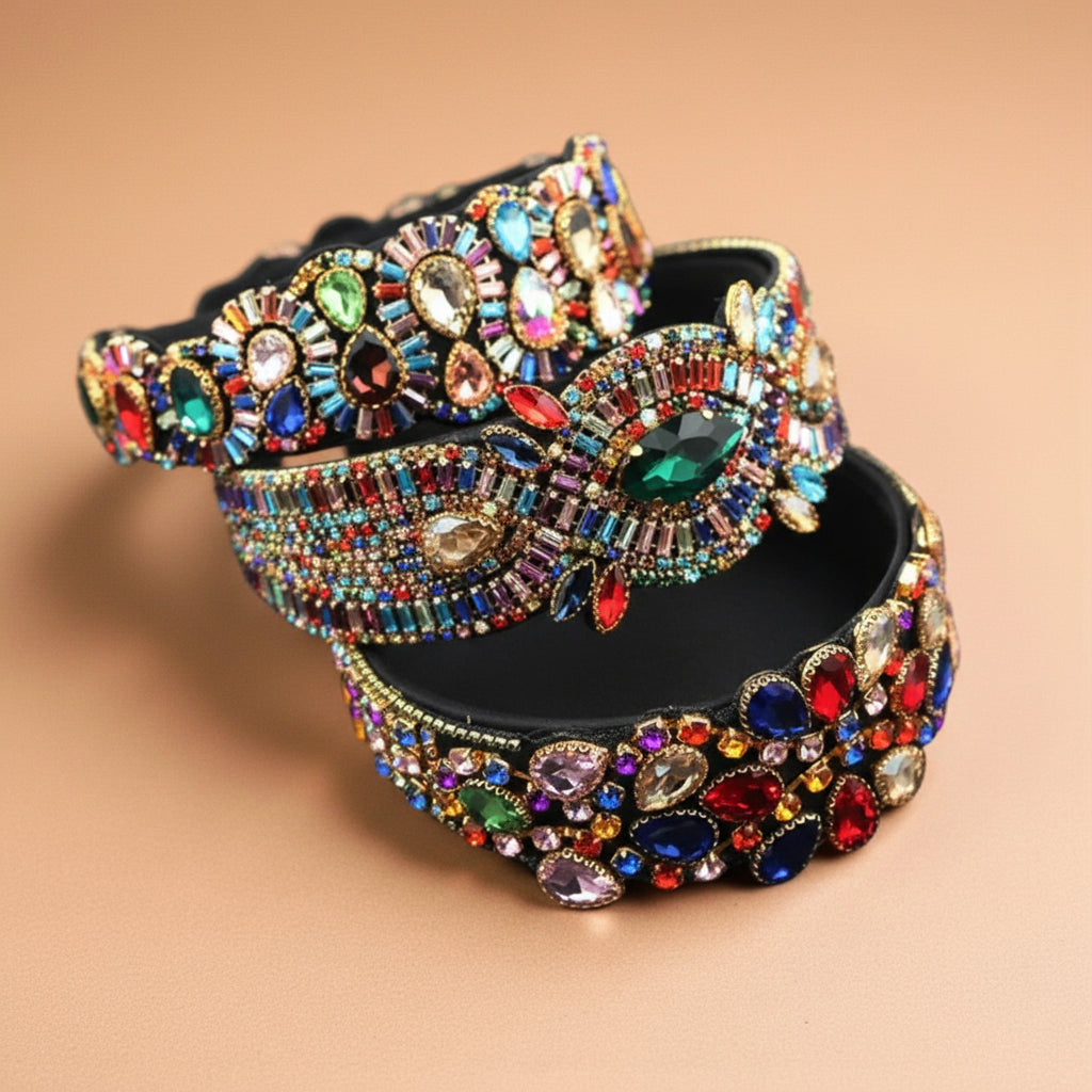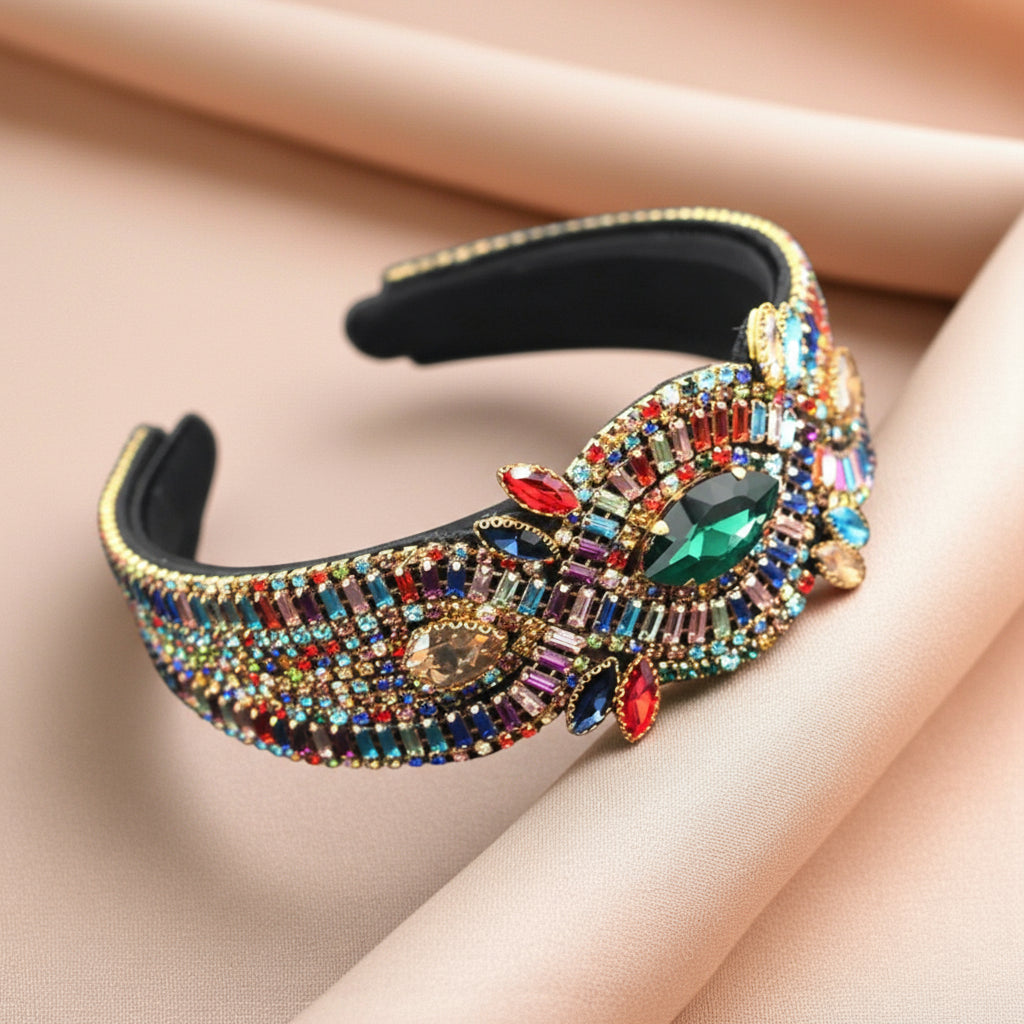 Elegância premium em cristais coloridos sofisticados com design ornamental. Bandolete que combina tradição e modernidade.