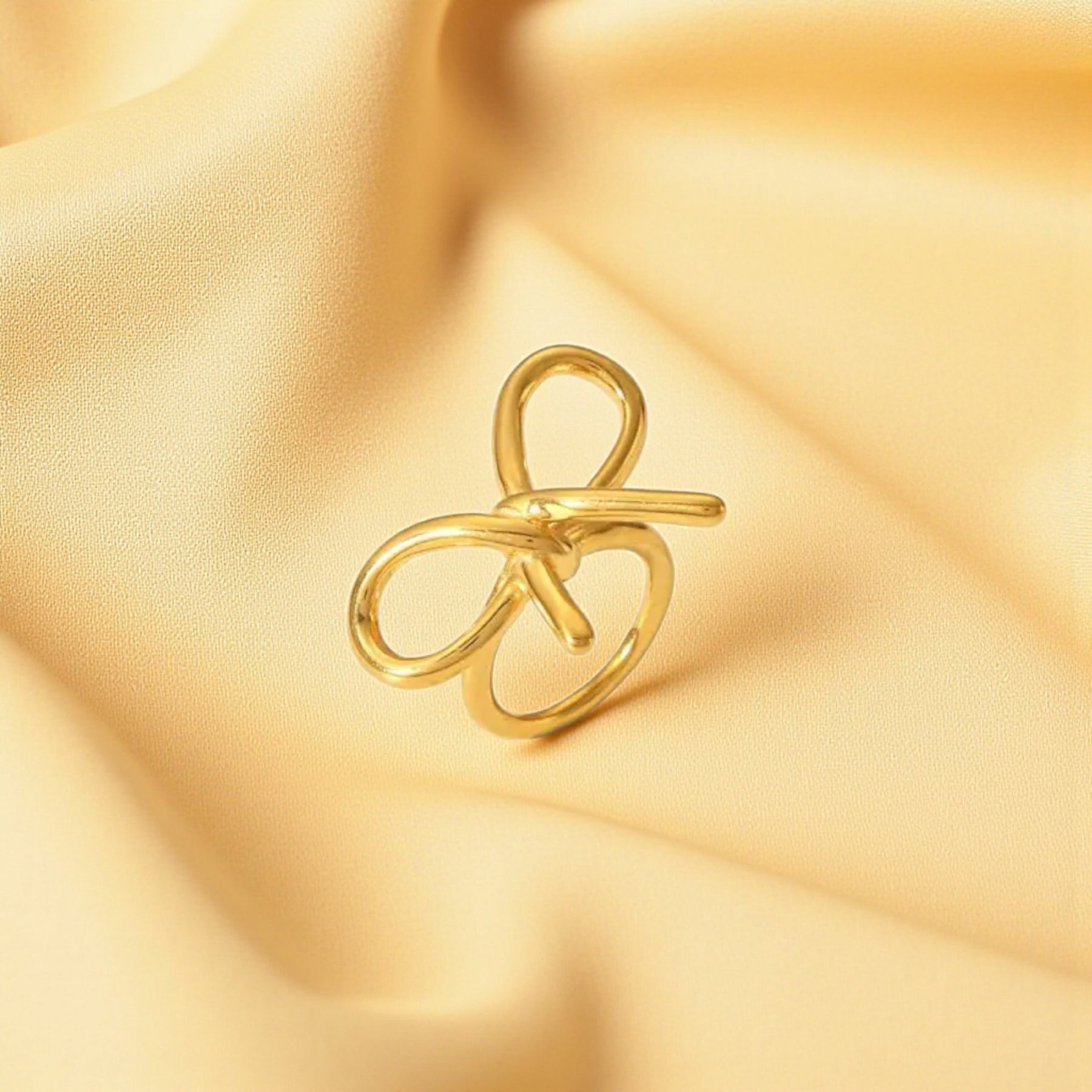 Elegância grega em aço inoxidável com banho de ouro 18k premium. Design com laço que combina tradição e modernidade.