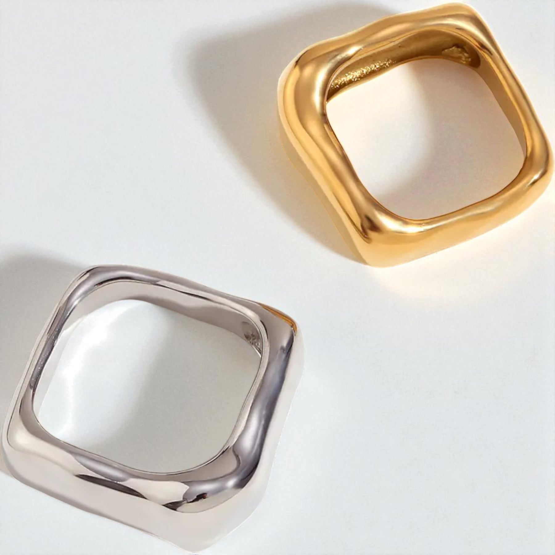 Elegância premium em aço inoxidável banhado a ouro 18k. Design geométrico quadrado que combina tradição e modernidade.