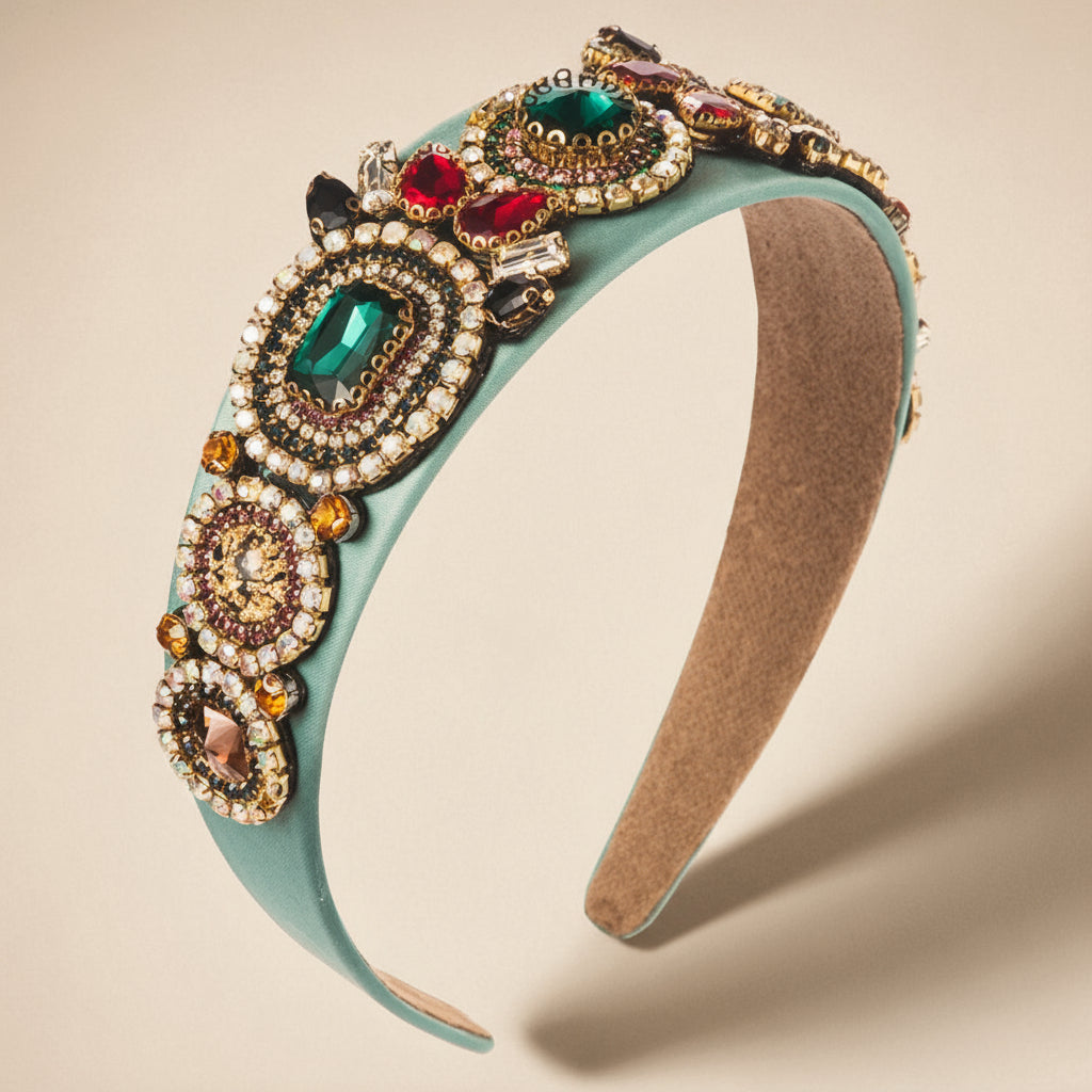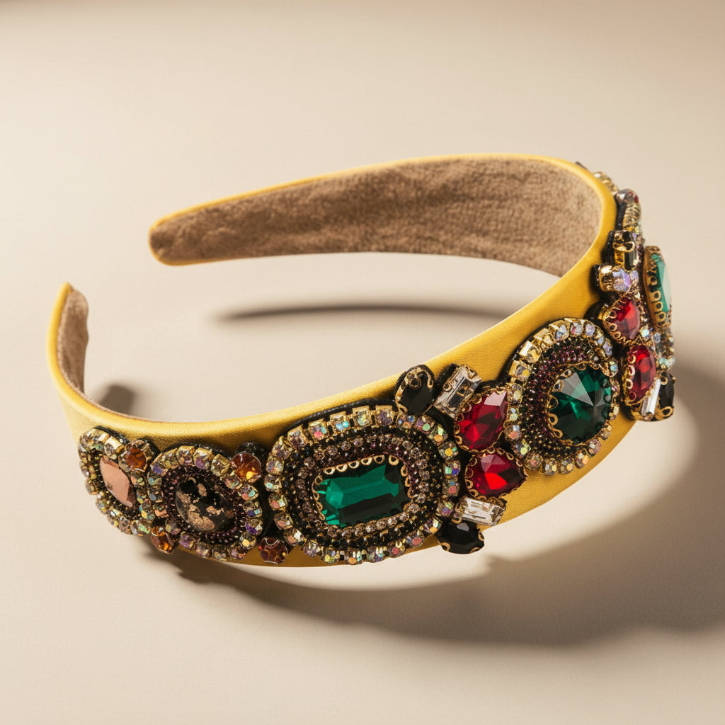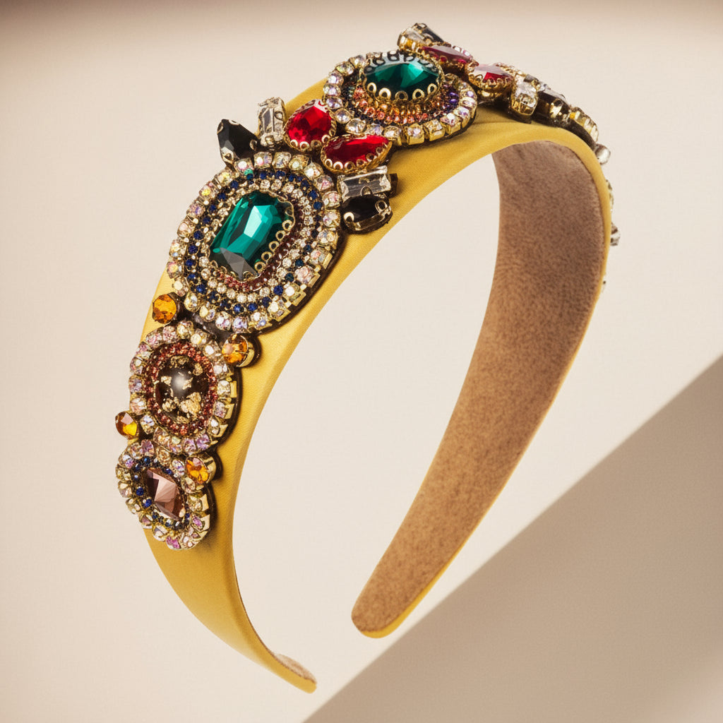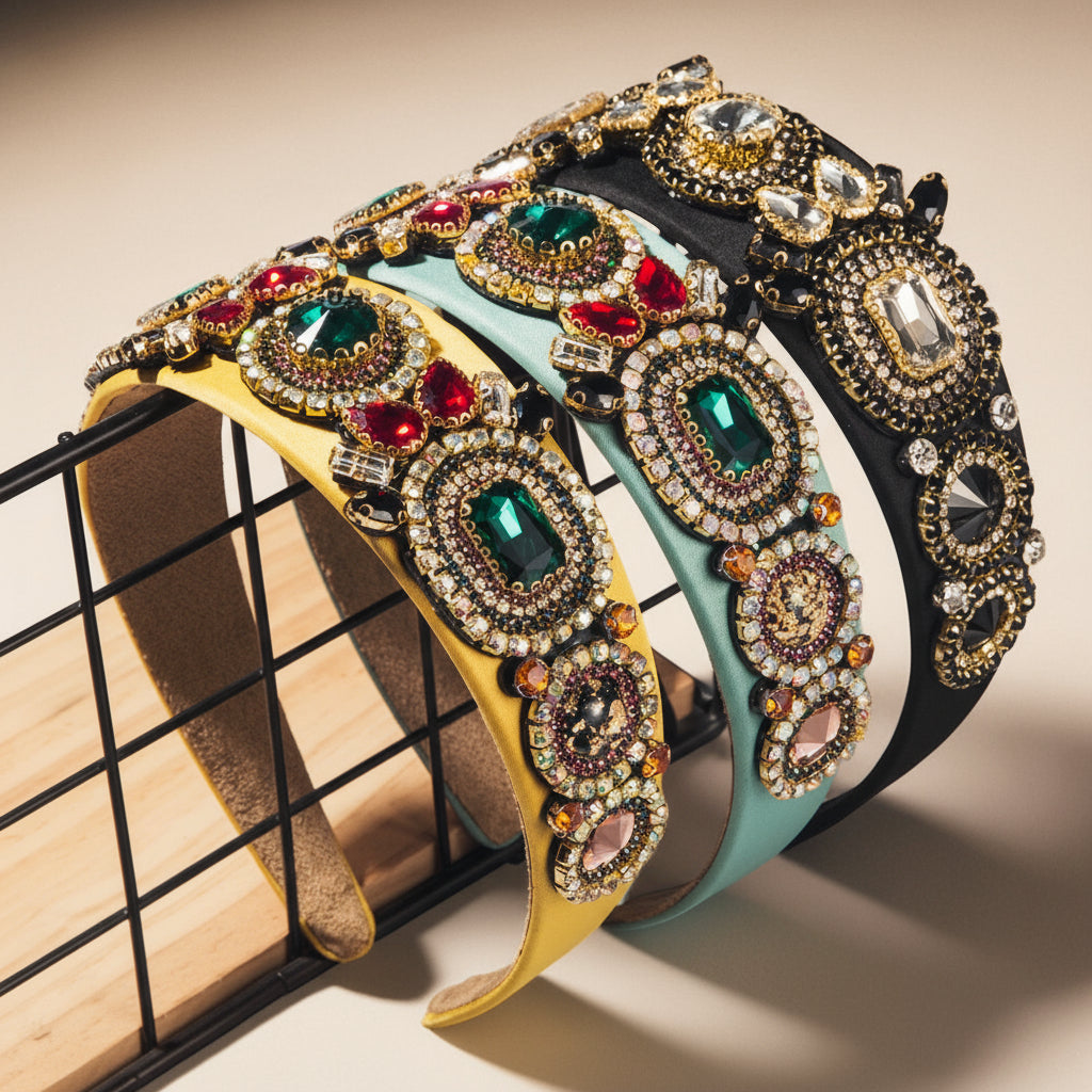Elegância premium em cristais coloridos com design barroco. Bandolete sofisticada que combina tradição e modernidade.