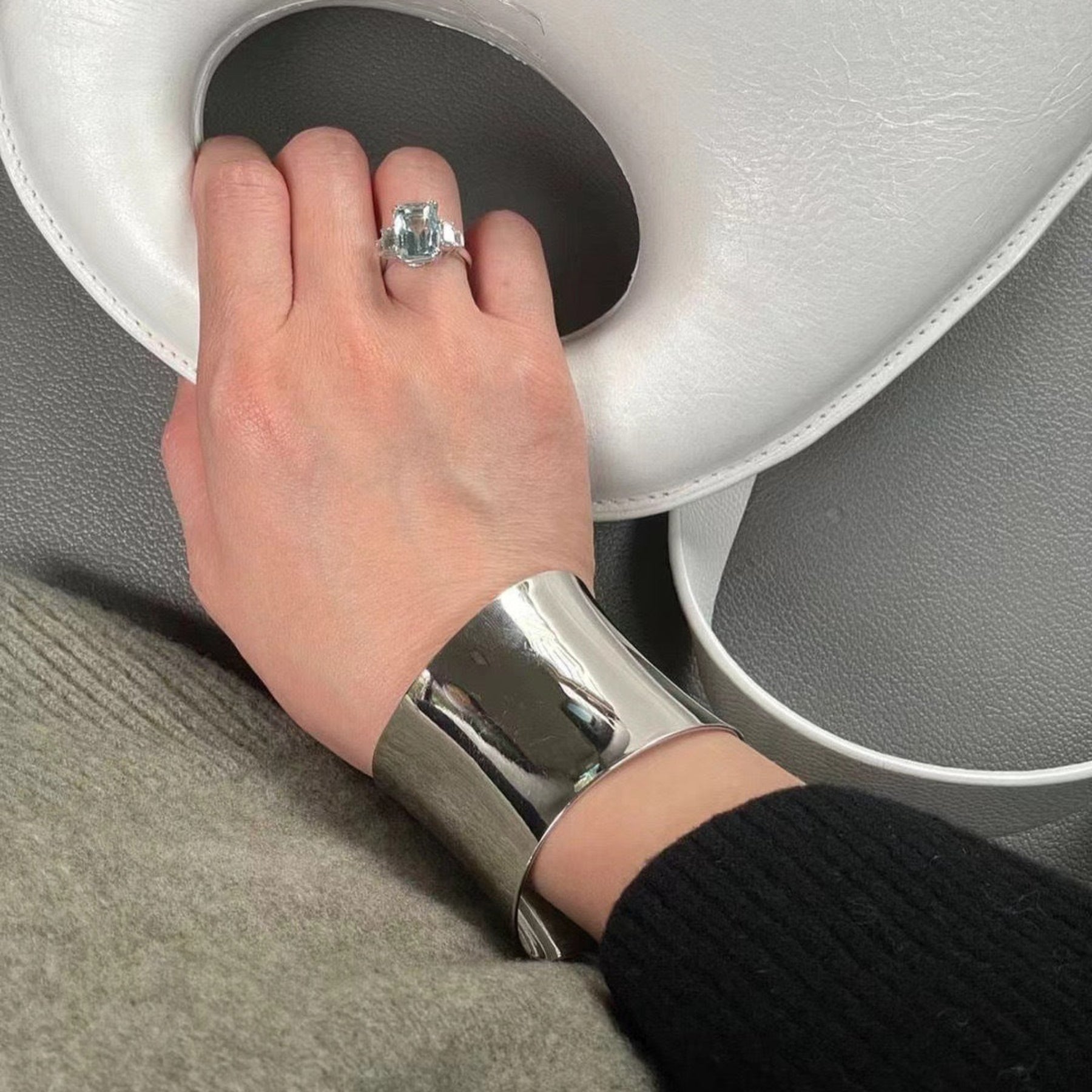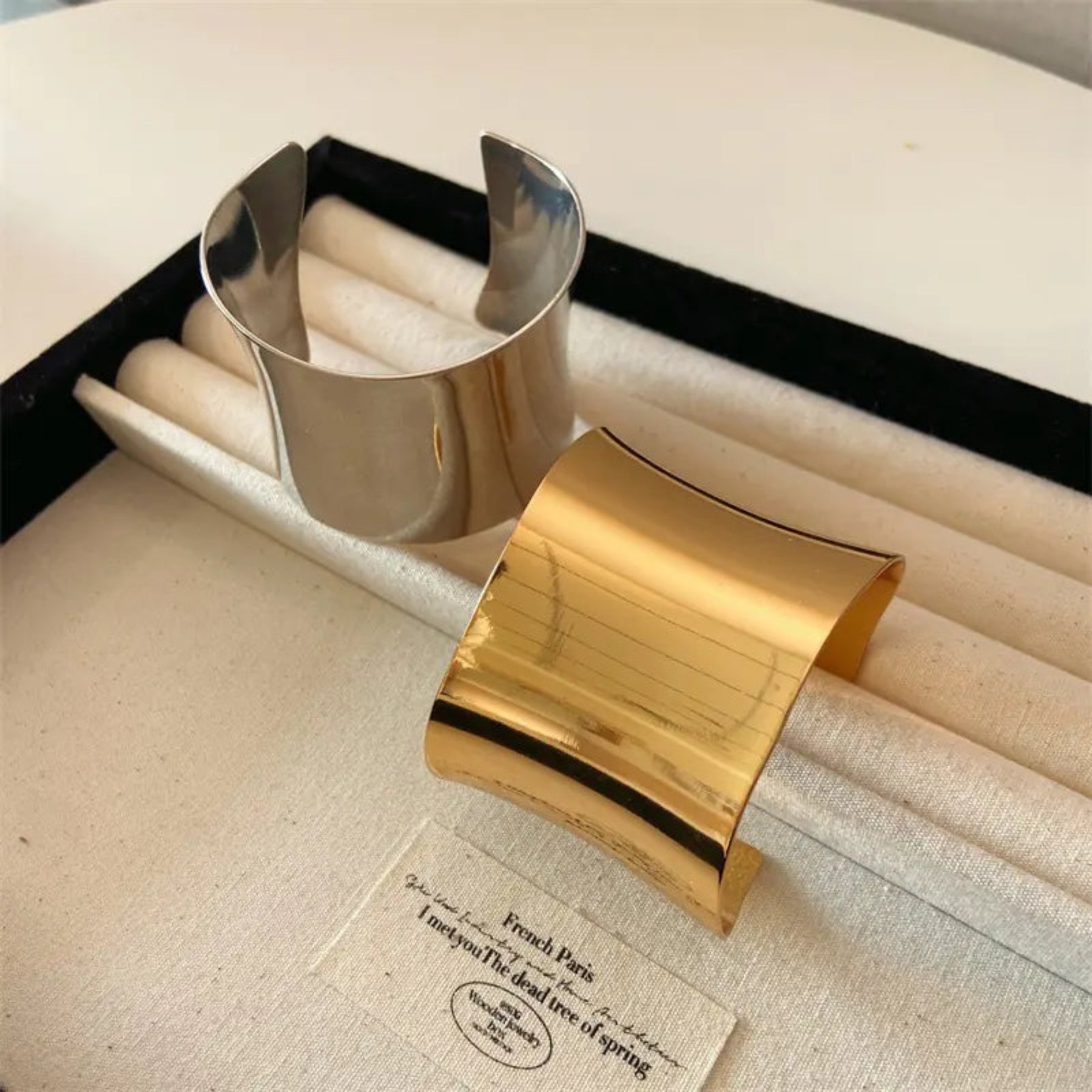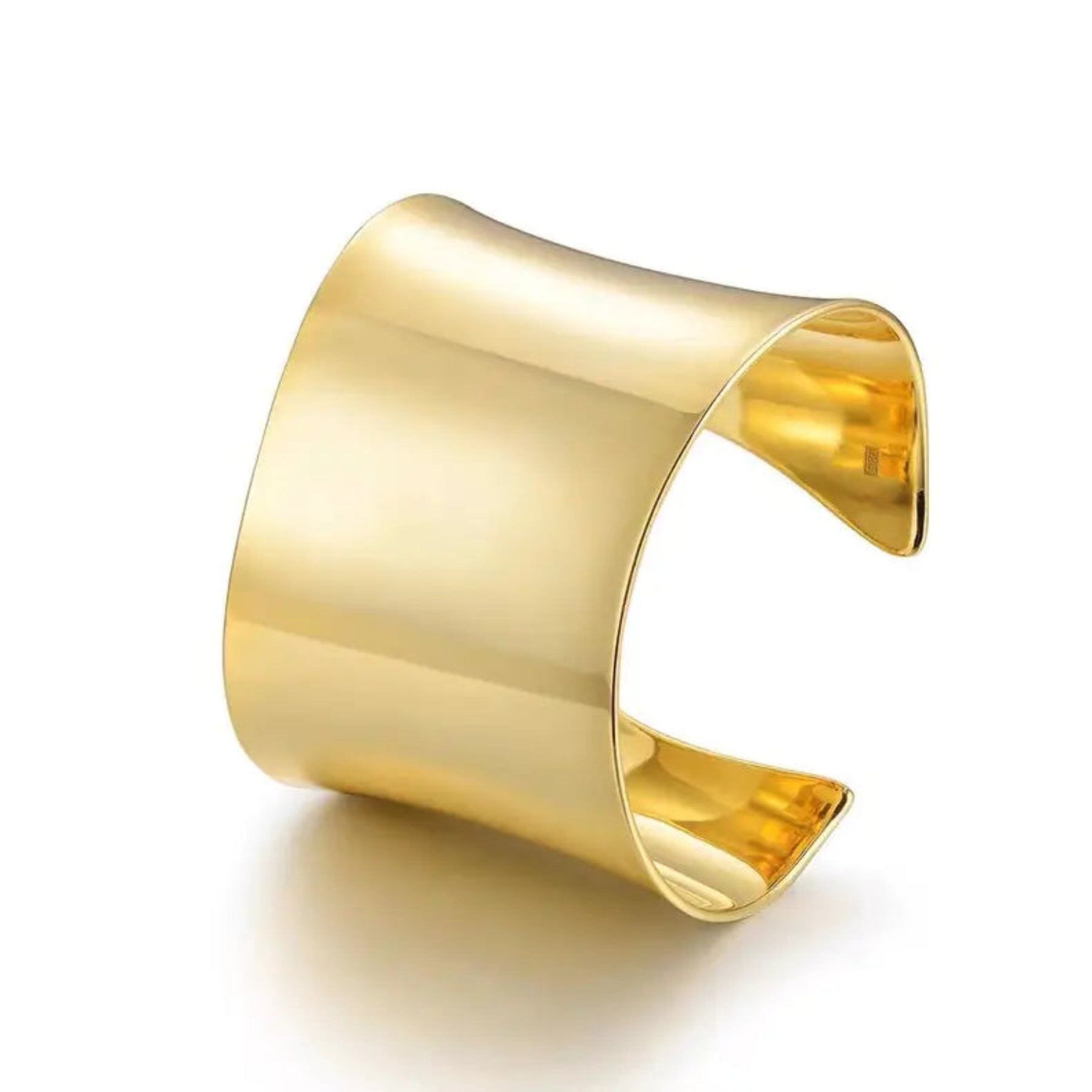 Elegância premium em design curvo largo brilhante. Pulseira statement que combina tradição e modernidade.