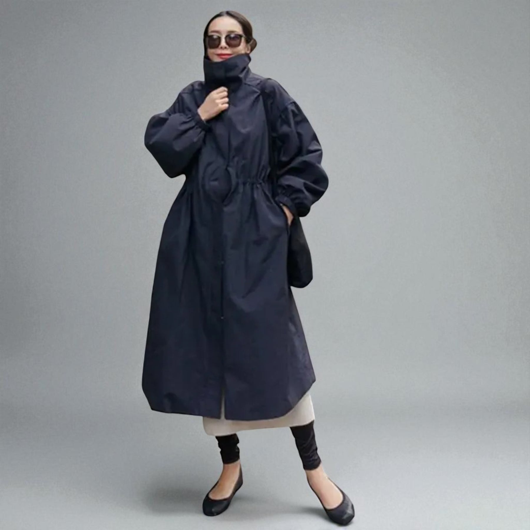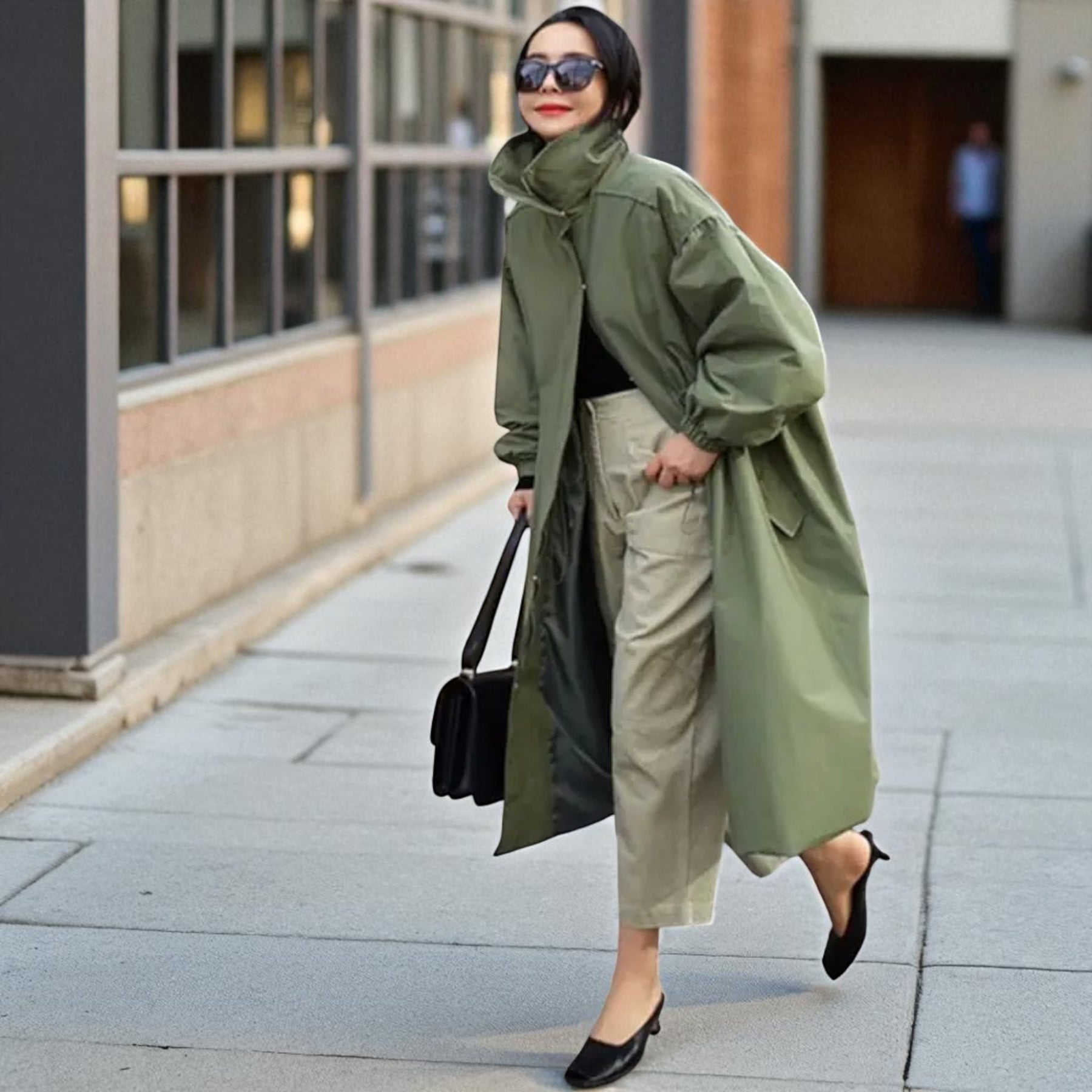 Elegância emiliana em tecido premium corta-vento. Design midi que combina tradição e modernidade.