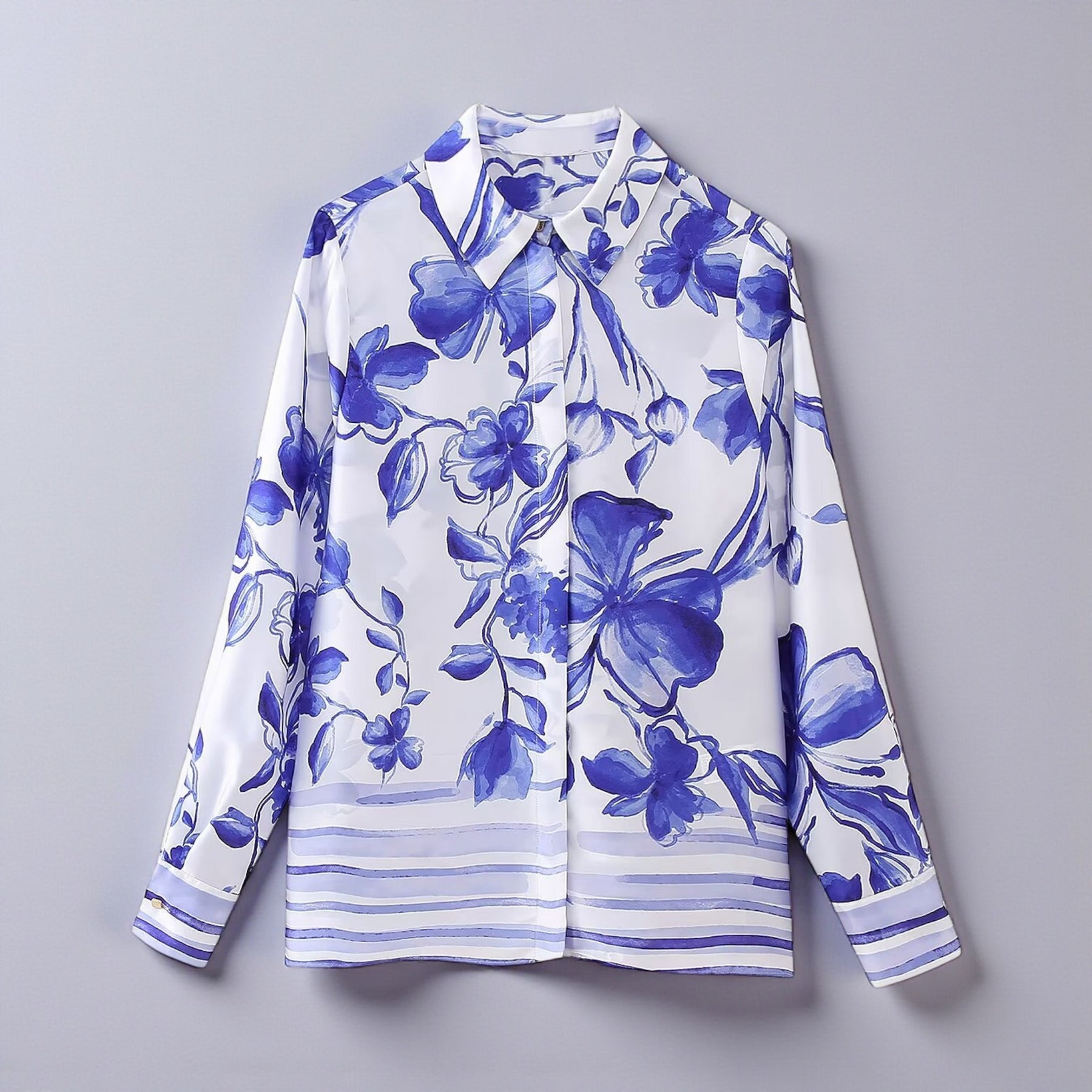 Elegância mediterrânica em cada detalhe. Design sofisticado com estampado floral azul que combina tradição e modernidade.